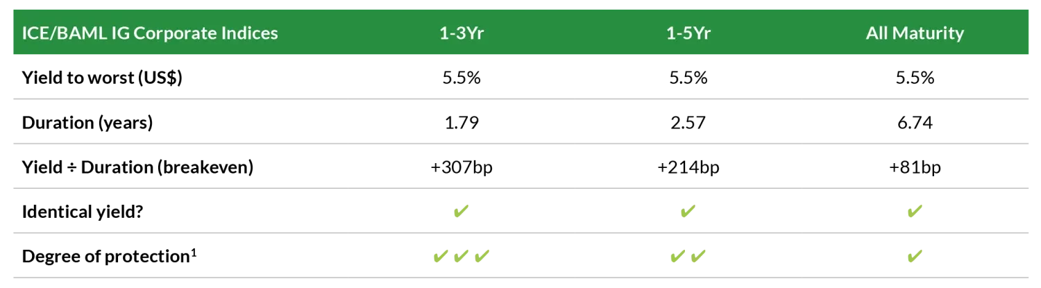 In summary - yes I think there is – short dated Investment Grade credit. The longer form case for short dated IG right now has three main components that make the story compelling to me; firstly the huge rise in yields last year in line with rate hikes means the valuation right now, especially at the front end, is historically extreme; second the traditional favourable risk-adjusted return profile that short dated IG has consistently provided is always welcome in portfolios, but especially so now in what is likely to remain a volatile environment; and thirdly, the flatness of yield curves today means by and large there is no additional yield in longer dated credit, so why take the additional capital risk when you can get paid the same yield in short dated?