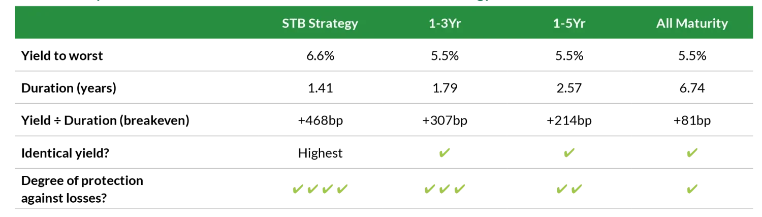 This means the breakeven yield of our STB Strategy in US$ is 6.6% / 1.41 = 4.68%, or 468 basis points! And I think nearly 500 basis points of protection against rising yields is a huge amount of protection against any unexpected losses this year from terminal rates edging higher, inflation remaining sticky, or lingering concerns on small US community banks for example. Putting our STB Strategy into the same table as before, shows the improvement that can be made through active management: